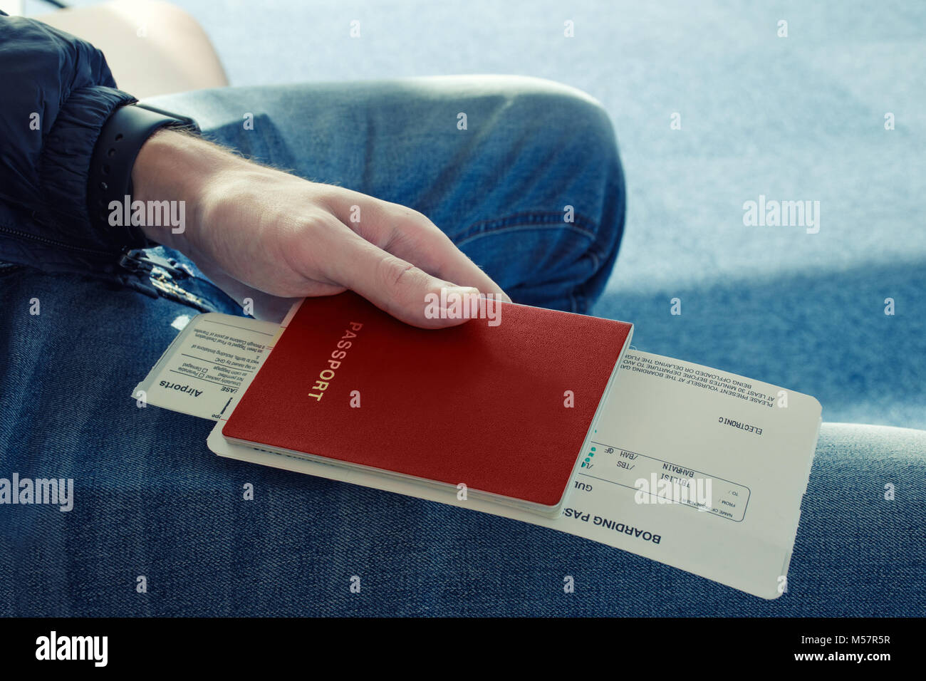 Man In Blue Jeans Sits And Holds In His Hand Passport Of Red Color With Tickets To Plane Slose Up Top View Stock Photo Alamy